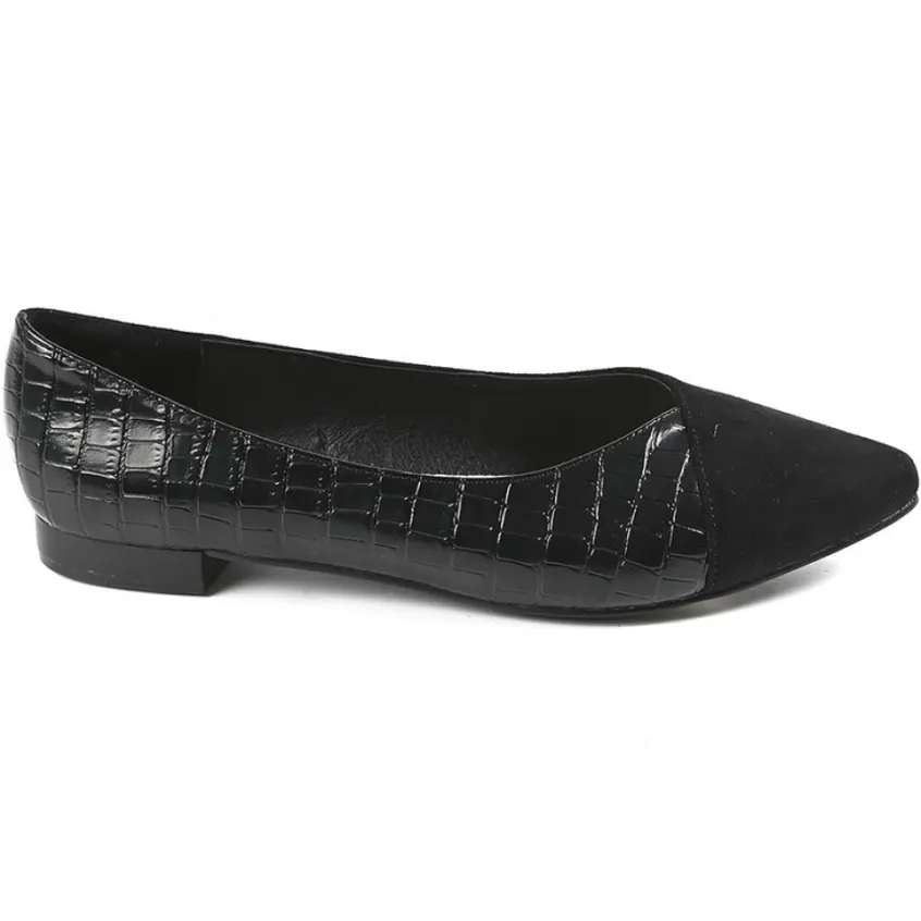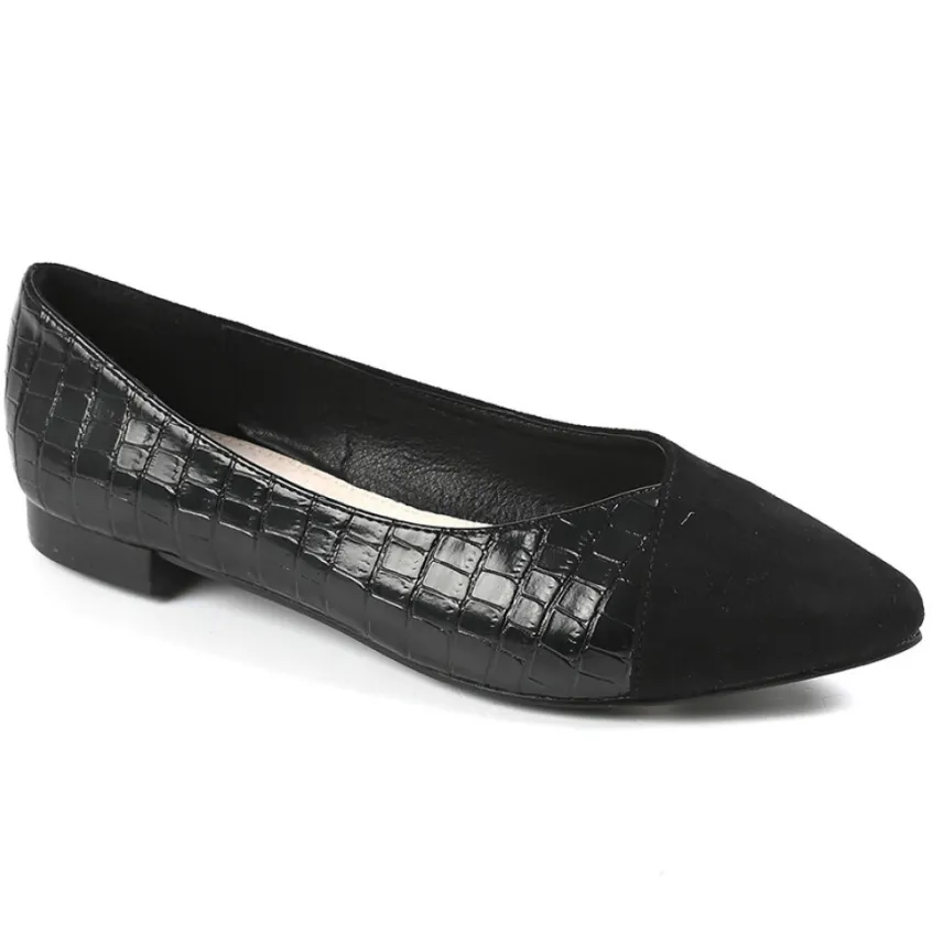 Ballerines Femme Noir Effet Croco Vice Versa: Toute En Élégance, Cette Ballerine Noire Effet Croco Joue Avec Les Matières. On Craque Pour Ce Modèle Au Bout Pointu Hyper Tendance Qui Viendra Affiner Votre Pied. Son Petit Plus : Cette Ballerine Femme Bi-Matière Associe Le Côté Chic Du Motif Croco À Une Matière Effet Suède Très Chaleureuse.Pour Ne Rien Gâcher, Cette Ballerine Possède Une Semelle Intérieure Cuir Qui Vous Procurera Un Amorti Et Un Confort De Marche Optimal. Un Modèle À Porter Avec Une Combinaison Noire Et Des Accessoires Dorés Pour Un Look Bcbg Assumé.Caractéristiques : Marque Vice Versa, Coloris Noir, Dessus En Synthétique Et Textile, Doublure Synthétique, Semelle Intérieure Cuir, Semelle Élastomère.