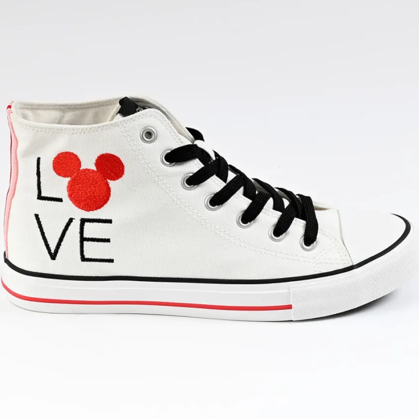 Baskets Montantes Mickey Femme Blanc: Ces Baskets Mickey Pour Femme Sont Un Choix Idéal Pour Les Fans De La Célèbre Souris. Leur Design Audacieux Et Amusant Ne Laissera Personne Indifférent. Confectionnées Dans Une Toile Légère, Elles Sont Montées Sur Une Semelle Souple Qui Les Rend Confortables Et Pratiques Au Quotidien.Le Mot ‘Love’, Délicatement Brodé Dans La Toile, Se Voit Surmonté Des Mythiques Oreilles De Mickey, Tandis Qu’Un Double Liseré Noir Et Rouge Habille La Semelle. Un Galon Rouge Et Rose Rayé Plein De Pep’s Vient Réveiller L’Arrière De La Chaussure, Et Les Lacets Blancs Caractéristiques De La Conventionnelle Chaussure En Toile Sont Ici Remplacés Par Des Lacets D’Un Noir Intense.Caractéristiques: Marque Mickey, Coloris Blanc, Dessus En Textile, Doublure Textile, Semelle Intérieure Textile, Semelle Élastomère.