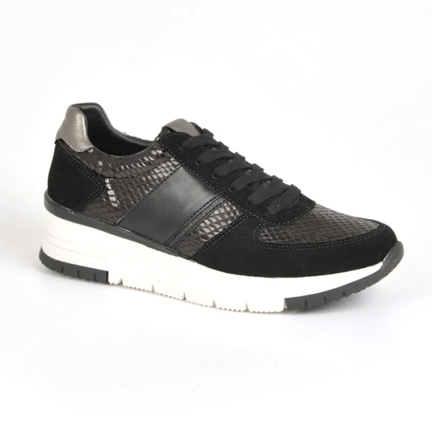 Baskets Avec Effet Reptile Street Life Noir: Baskets Avec Effet Reptile Femme, Marque Street Life, Coloris Noir, Dessus En Synthétique, Doublure Textile, Semelle Intérieure Synthétique, Semelle Élastomère, Talon 4 Cm.