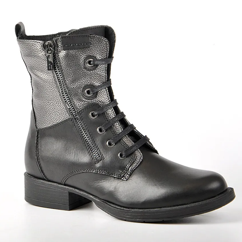 Bottines Femme Plates Bi-Matières Tipo Alto Noir: Bottines Femme Plates Bi-Matières, Marque Tipo Alto, Coloris Noir, Dessus En Cuir, Doublure Textile, Semelle Intérieure Cuir, Fermeture Avec Zip, Semelle Élastomère, Talon 2.5 Cm.