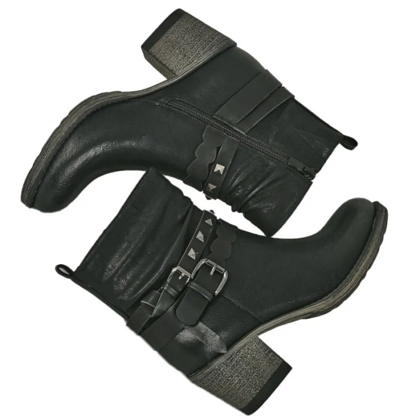 Bottines À Talon Femme Noir Style Western Vice Versa: Cet Automne, Laissez-Vous Tenter Par La Tendance Western Chic Qui Souffle Sur Nos Collections ! Découvrez Ces Bottines Cowboy Noires Vice Versa, Fusion Parfaite Entre Élégance Et Audace !On Vous Donne Nos 3 Bonnes Raisons De Les Adopter Sans Plus Tarder :• Un Style Intemporel : Déclinée Dans Un Noir Profond, Cette Bottine Au Bout Arrondi Et À La Tige Plissée Se Montre Bien Plus Sage Que L’Iconique Santiag. • Des Détails Rock : Pour Plus De Modernité, Ces Chaussures Pour Femme Sont Dotées De Lanières Ornées De Clous Et D’Une Boucle Métallisée. • Chaleur Et Confort Au Quotidien : Une Doublure Fourrée, Un Talon Carré 5.5 Cm, Une Semelle Moelleuse… Que Dire De Plus ?Caractéristiques : Dessus En Synthétique, Doublure Textile, Semelle Intérieure Synthétique, Fermeture Avec Zip, Semelle Élastomère, Talon 5.5 Cm.