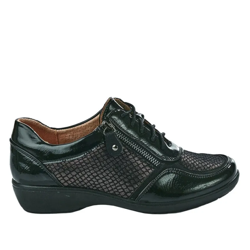 Baskets Confort Femme Bi-Matières Noir Lady Confort: Le Confort D’Une Basket Associé Au Charme D’Un Derby ! Parce Qu’Il Est Aussi Important De Se Sentir Bien Que Belle Dans Ses Baskets, Chaussexpo Vous Propose Ces Élégantes Chaussures Confort Pour Femme De La Marque Lady Confort. Dotée D’Une Doublure Et D’Une Semelle Intérieure En Cuir, Cette Paire De Baskets Noires Vous Procurera Un Confort Sans Pareil.Grâce À Sa Fermeture À Zip Sur Le Côté, Vous Chausser Deviendra Un Jeu D’Enfant. Un Talon Compensé De 3 Cm Vous Offrira La Hauteur Nécessaire Pour Marcher En Tout Confort. Enfin, Ces Baskets Bi-Matières Séduisent Par Leurs Jeux De Matières Chic Et Élégant : Le Fruit Du Mariage De Matières Vernies Et Irisées.Caractéristiques : Dessus En Synthétique, Doublure Cuir, Semelle Élastomère.