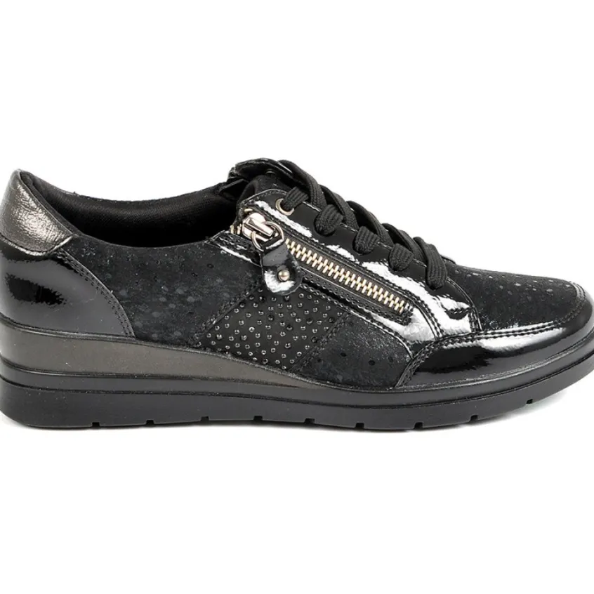Baskets Femme Avec Strass Lady Confort Noir: Grand Confort, Forme Largebaskets Femme Avec Strass Confort, Marque Lady Confort, Coloris Noir, Dessus En Synthétique Et Textile, Doublure Textile, Semelle Intérieure Cuir, Fermeture Avec Zip, Semelle Élastomère, Talon Compensé 4 Cm.