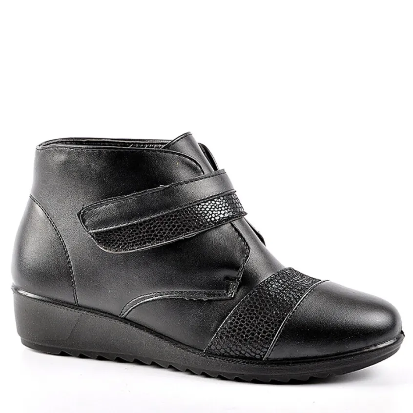 Bottines Compensées Lady Confort Noir: Grand Confort, Forme Large Bottines Compensées Femme Confort, Marque Lady Confort, Coloris Noir, Dessus En Synthétique, Doublure Fourrée, Semelle Intérieure Fourrée, Fermeture À Scratch, Semelle Élastomère, Talon 3.5 Cm.