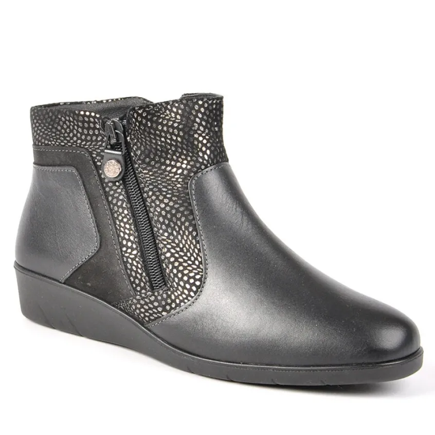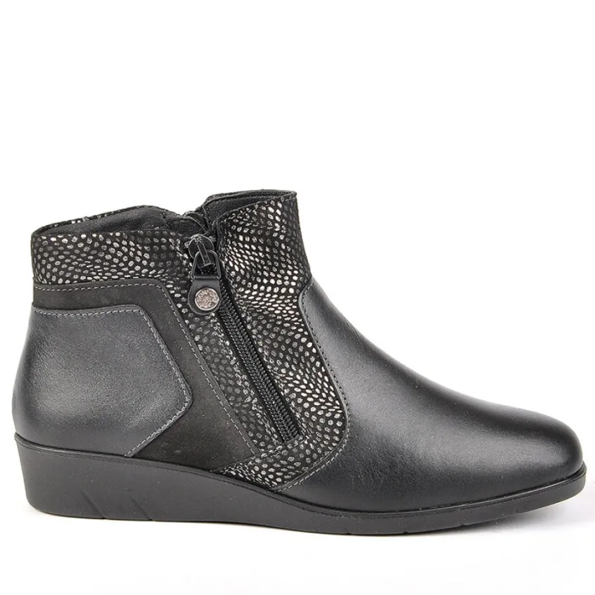 Bottines Femme Compensées Avec Zip Sur Le Côté Confort Noir: Chaussures Femme Confort, Coloris Noir, Forme Large.Pour Les Journées Un Peu Plus Fraîches, Rien De Mieux Qu’Une Paire De Bottines Femme Compensées, Surtout Si Ces Chaussures Sont Confort. De La Marque Lady Confort, Les Bottines Compensées Avec Fermeture À Zip Vous Permettent Un Maintien De Vos Pieds Optimal Toute La Journée. Son Dessus En Cuir, Sa Doublure Textile, Sa Semelle Intérieure Cuir Et Sa Semelle Élastomère Permettent D’Avoir Des Chaussures Faciles À Enfiler Et Très Souples. Profitez Également Des Talons De 3 Cm Qui Vous Permettront De Ne Pas Abîmer Vos Talons, Ni Votre Dos. En Plus Du Côté Confort De Vos Bottines Femme, Vous Pourrez Aussi Les Porter Avec N’Importe Laquelle De Vos Tenues.