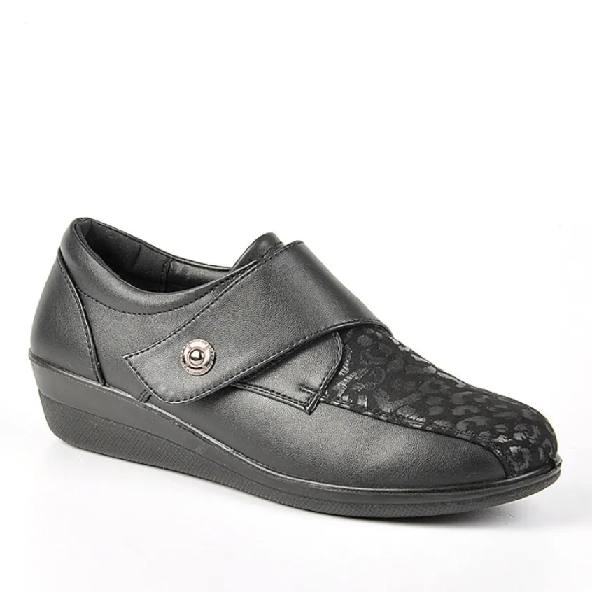 Derbies Confort Bi-Matières Noir: Grand Confort, Forme Large Chaussures Confort Bi-Matières Femme Confort, Marque Lady Confort, Coloris Noir, Dessus En Synthétique, Doublure Synthétique, Semelle Intérieure Cuir, Fermeture À Scratch, Semelle Élastomère, Talon 3.5 Cm.