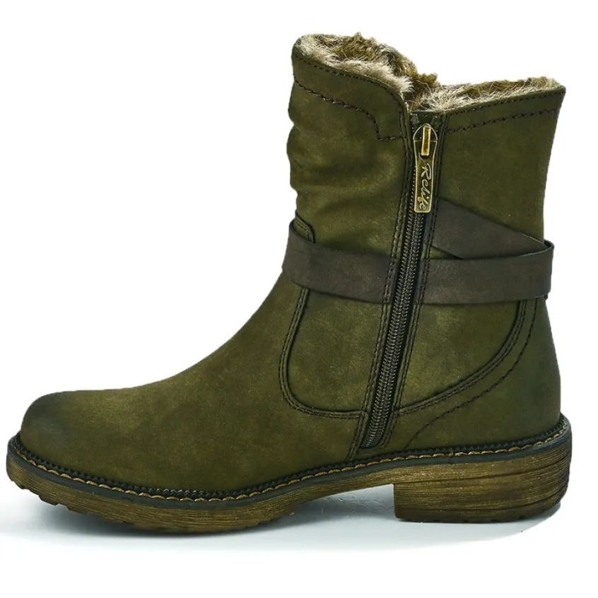 Bottines Plates Femme Relife Kaki: Grand Confort, Forme Largebottines Plates Femme Confort, Marque Relife, Coloris Kaki, Dessus En Synthétique, Doublure Fourrée, Semelle Intérieure Textile, Fermeture Avec Zip, Semelle Élastomère, Talon 3 Cm.