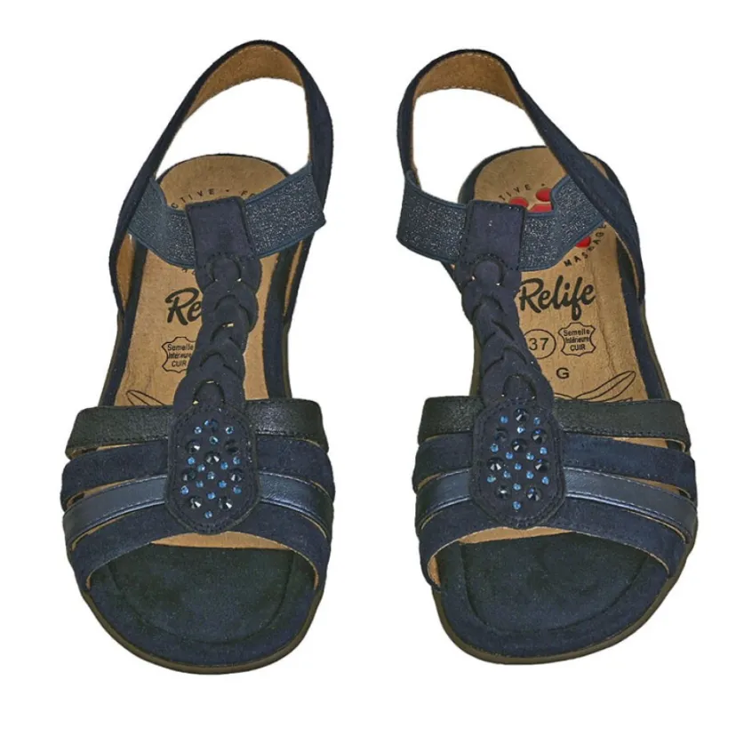 Sandales Plates Avec Strass Relife Bleu: Grand Confort, Forme Large Sandales Plates Avec Strass Femme Confort, Marque Relife, Coloris Bleu, Dessus En Synthétique, Doublure Textile, Semelle Intérieure Cuir, Semelle Élastomère, Talon 2 Cm.