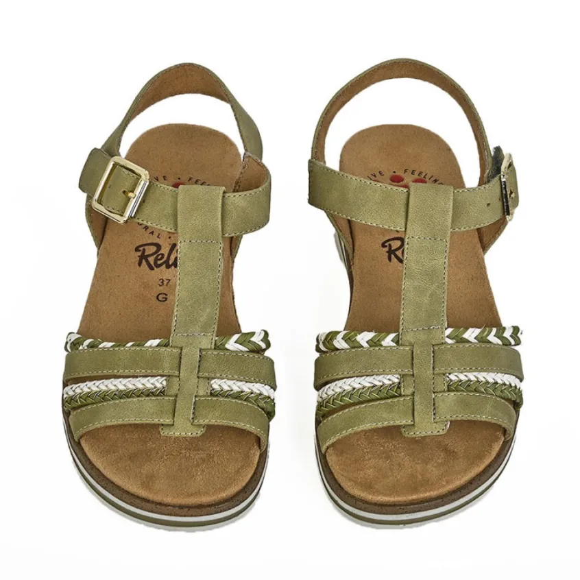 Sandales Plates Femme Relife Kaki: Grand Confort, Forme Largesandales Plates Femme Confort, Marque Relife, Coloris Kaki, Dessus En Synthétique, Doublure Textile, Semelle Intérieure Textile, Semelle Élastomère, Talon 3.5 Cm.