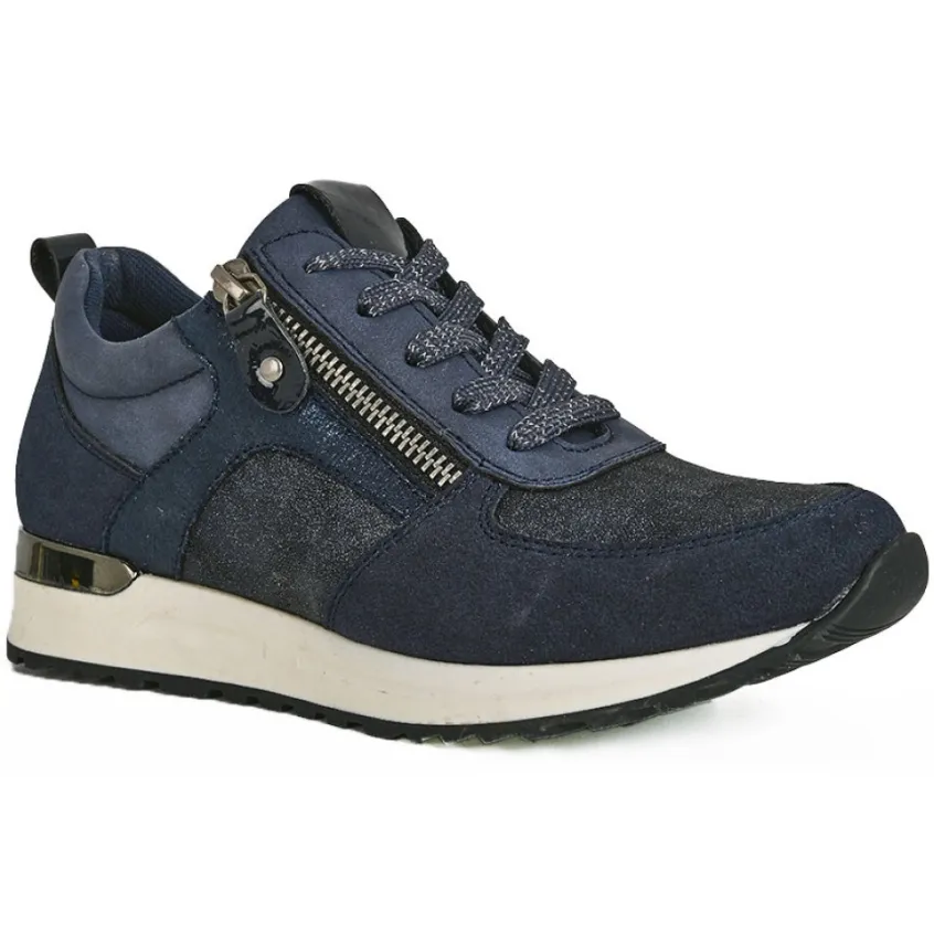 Baskets Confort Femme Bleu Marine À Fermeture Éclair Scalina: Tout En Brillance Et En Élégance, Cette Basket Bleu Marine Arbore Un Style Féminin Et Moderne. Conçue Spécialement Pour Les Pieds Sensibles, Cette Chaussure De La Marque Scalina Enveloppera Votre Pied De Confort Grâce À Sa Semelle Intérieure En Cuir Amovible.Sa Tige Irisée Est Mise En Valeur Par Des Lacets Incrustés De Fil Argenté Ainsi Que Par Un Insert Métallisé Sur La Semelle. Enfin, Une Fermeture À Glissière Vous Permettra De Les Enfiler En Un Éclair ! Une Basket Confort Chic Et Dynamique Pour Celles Qui Recherchent Un Confort Sans Compromis.Caractéristiques : Grand Confort, Forme Large, Dessus En Synthétique, Doublure Textile, Semelle Intérieure Cuir, Fermeture Avec Zip, Semelle Élastomère.