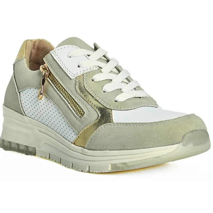 Baskets Femme Blanc Et Beige Scalina: Laissez-Vous Séduire Par Notre Basket Blanche Et Beige Scalina Au Confort Incomparable ! Son Design Épuré Et Élégant À La Fois Est Le Fruit D’Un Mariage De Matières Et De Coloris Étonnant. Ainsi, La Tige Blanche Perforée S’Associe À Des Empiècements Lisses Beiges Et Dorés. Cette Basket Aux Coloris Ultra Tendance Apportera Une Touche De Brillance À Tous Vos Looks.Vous L’Apprécierez Aussi Pour Son Confort :Sa Forme Large S’Adapte À La Morphologie De Votre Pied. Sa Semelle Intérieure Cuir Moelleuse. Munie D’Une Fermeture À Zip, Cette Basket Se Chausse Facilement. Sa Semelle Crantée Montée Sur Un Talon Compensé.Des Baskets Confort Pour Les Femmes Actives En Quête D’Une Allure Élégante.Caractéristiques : Dessus En Synthétique, Doublure Textile, Semelle Élastomère.