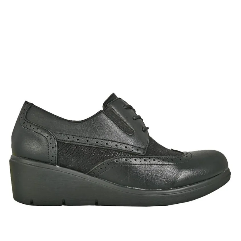 Derbies Compensées Femme Noir Bi-Matières Scalina: Grand Confort, Forme Large Derbies Bi-Matières Femme Confort, Marque Scalina, Coloris Noir, Dessus En Synthétique, Doublure Synthétique, Semelle Intérieure Cuir, Fermeture Avec Zip, Semelle Élastomère, Talon 4.5 Cm.