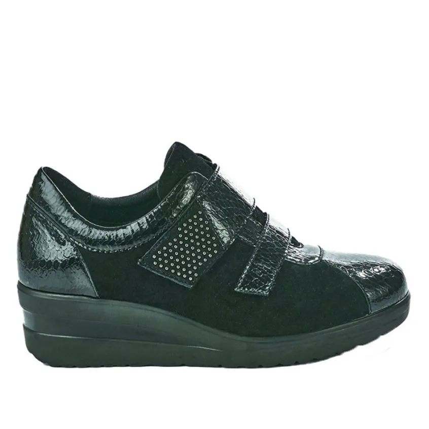 Derbies Femme Scalina Noir: Grand Confort, Forme Largederbies Femme Confort, Bi-Matières, Marque Scalina, Coloris Noir, Dessus En Cuir, Doublure Textile, Semelle Intérieure Cuir, Fermeture À Scratch, Semelle Élastomère, Talon 4.5 Cm.