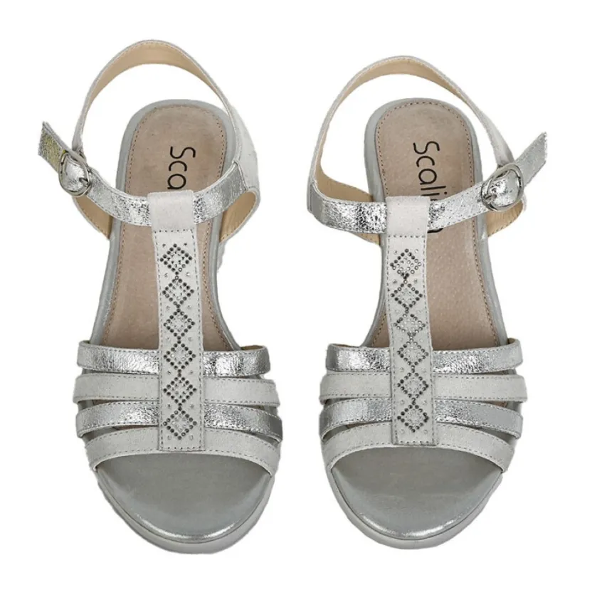 Sandales Compensées Femme Scalina Argenté: Grand Confort, Forme Largesandales Compensées Femme Confort, Bi-Matières, Marque Scalina, Coloris Argente, Dessus En Synthétique, Doublure Synthétique, Semelle Intérieure Cuir, Semelle Élastomère, Talon 5.5 Cm.