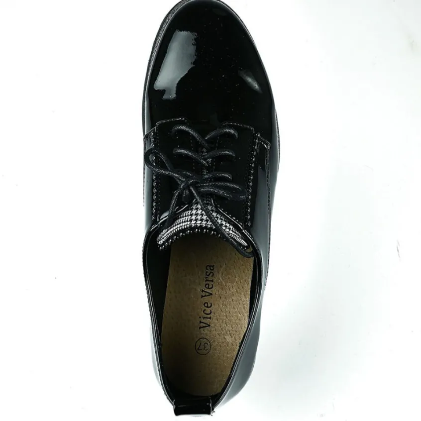 Derbies Femme Vice Versa Vernis Noir: Derbies Femme, Marque Vice Versa, Coloris Vernis Noir, Dessus En Synthétique, Doublure Synthétique, Semelle Intérieure Cuir, Semelle Élastomère.