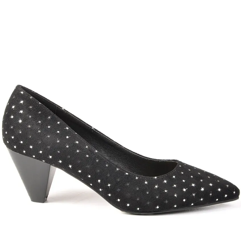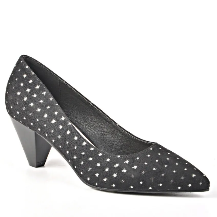 Escarpins Femme Noir À Pois Talon 5,5Cm Ana Luna: Une Cérémonie Ou Un Événement Exceptionnel À Célébrer ? Éblouissez Tous Les Invités Avec Cette Paire D’Escarpins Noir Et Argent De La Marque Ana Luna ! Bout Pointu, Talon Cubain De 5.5 Cm Et Tige Effet Velours : Tous Les Éléments Sont Réunis Pour Une Tenue Habillée Réussie !Mais La Vraie Bonne Idée De Ce Modèle, C’Est Son Motif À Pois Argentés Scintillant Pour Être La Star De La Soirée ! Rassurez-Vous, On N’Oublie Pas Votre Confort Pour Autant En Vous Proposant Cet Escarpin Pour Femme Dotée D’Une Semelle Intérieure En Cuir Moelleuse Et Respirante.Caractéristiques : Doublure Synthétique, Semelle Intérieure Cuir, Semelle Élastomère.