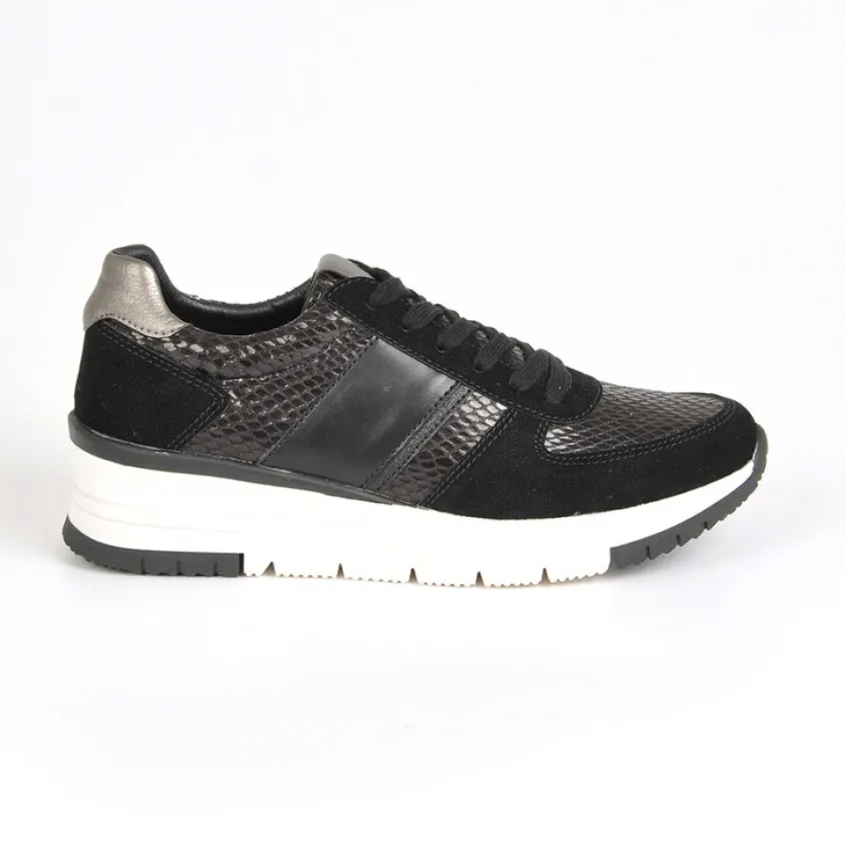 Baskets Avec Effet Reptile Street Life Noir: Baskets Avec Effet Reptile Femme, Marque Street Life, Coloris Noir, Dessus En Synthétique, Doublure Textile, Semelle Intérieure Synthétique, Semelle Élastomère, Talon 4 Cm.