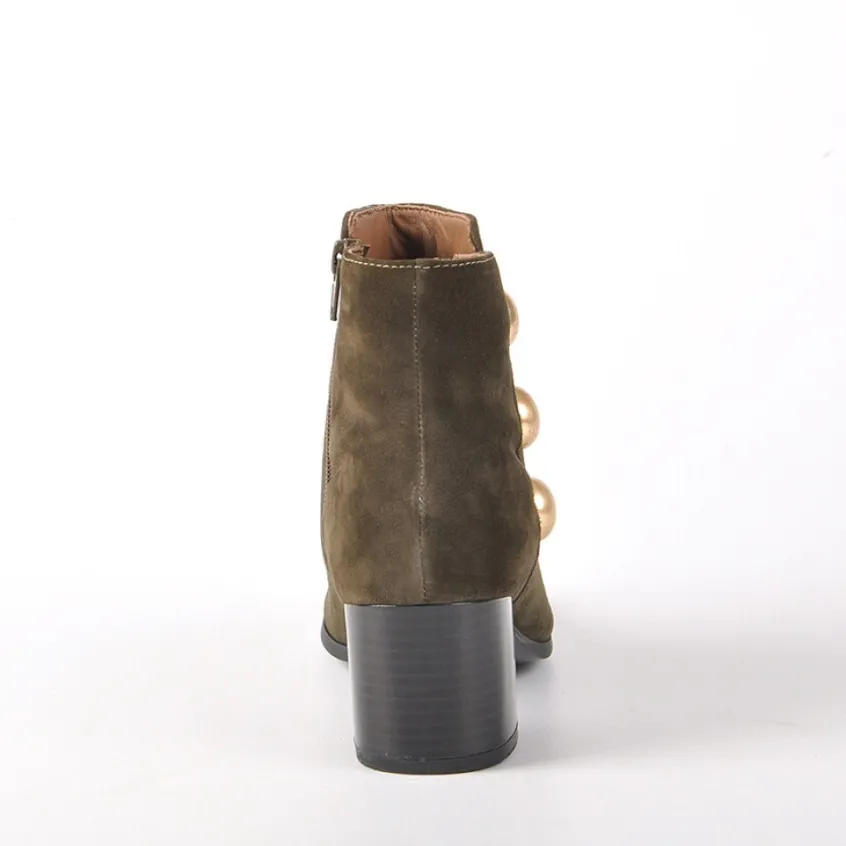 Bottines À Talons Avec Boutons Fantaisies Tipo Alto Kaki: Bottines À Talons Avec Boutons Fantaisies Femme, Marque Tipo Alto, Coloris Kaki, Dessus En Cuir, Doublure Textile, Semelle Intérieure Cuir, Fermeture Avec Zip, Semelle Élastomère, Talon 5 Cm.