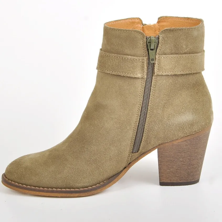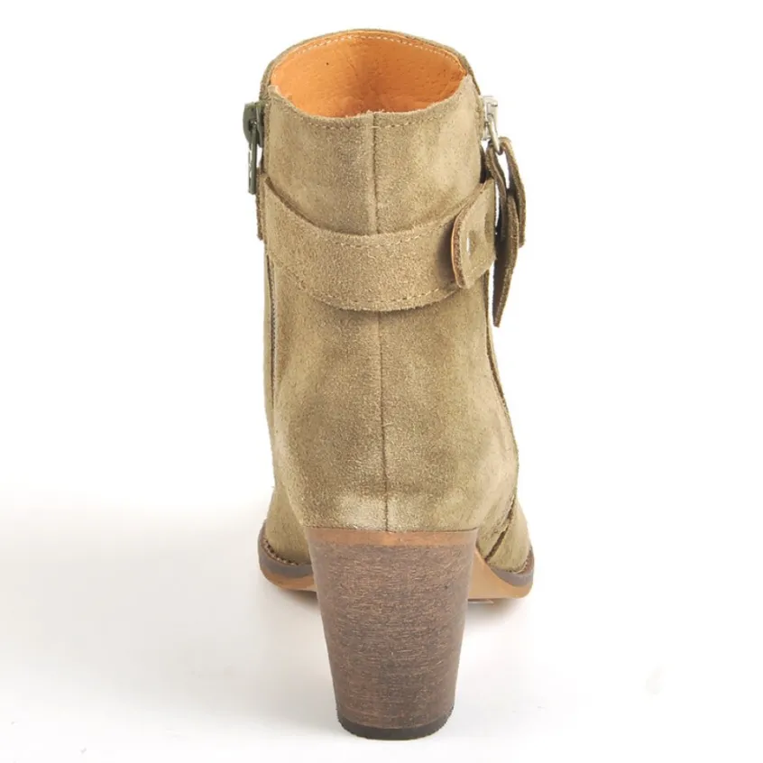 Bottines Femme À Talons Style Western Tipo Alto Kaki: Bottines Femme À Talons Style Western, Marque Tipo Alto, Coloris Kaki, Dessus En Cuir Velours, Doublure Textile, Semelle Intérieure Cuir, Fermeture Avec Zip, Semelle Élastomère, Talon 6 Cm.