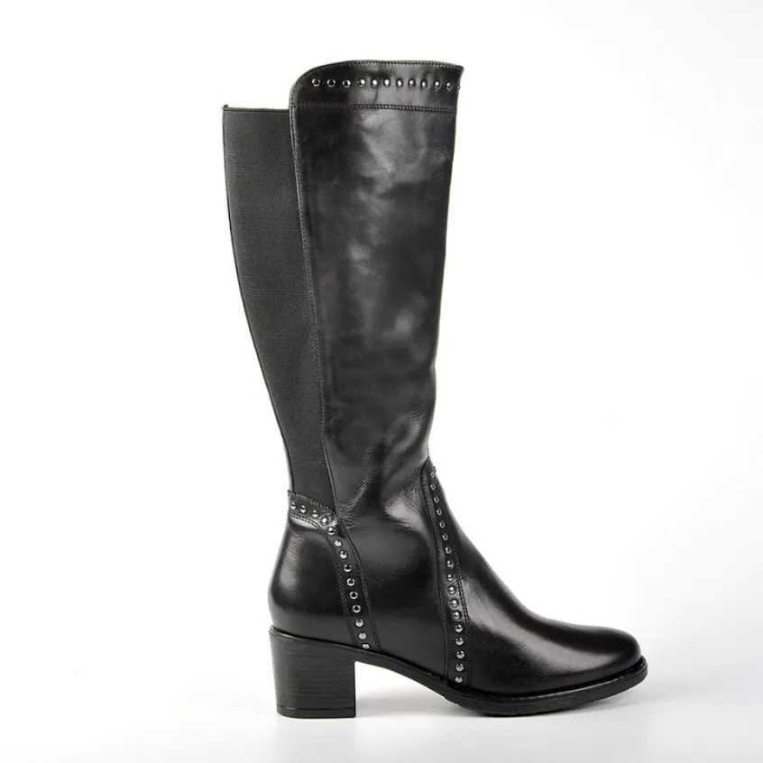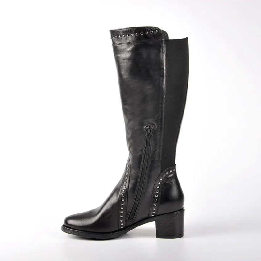 Bottes À Talons Avec Élastiques Tipo Alto Noir: Bottes À Talons Avec Élastiques Femme, Marque Tipo Alto, Coloris Noir, Dessus En Cuir, Doublure Textile, Semelle Intérieure Cuir, Fermeture Avec Zip, Semelle Élastomère, Talon 5 Cm, Hauteur De Tige 35 Cm, Tour De Mollet 32 Cm.