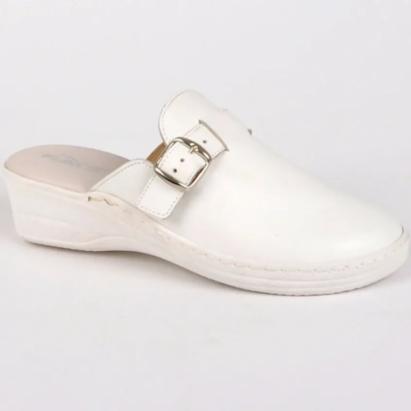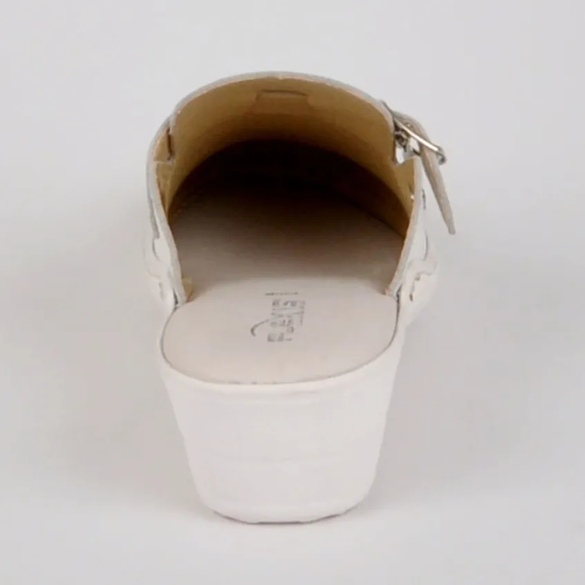Mules Sabots Avec Boucles Métalliques Flex’Is Blanc: Grand Confort, Forme Large Mules Sabots Avec Boucles Métalliques Femme Confort, Marque Flex’Is, Coloris Blanc, Dessus En Cuir, Doublure Synthétique, Semelle Intérieure Cuir, Semelle Élastomère, Talon 4 Cm.
