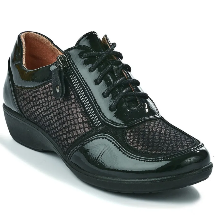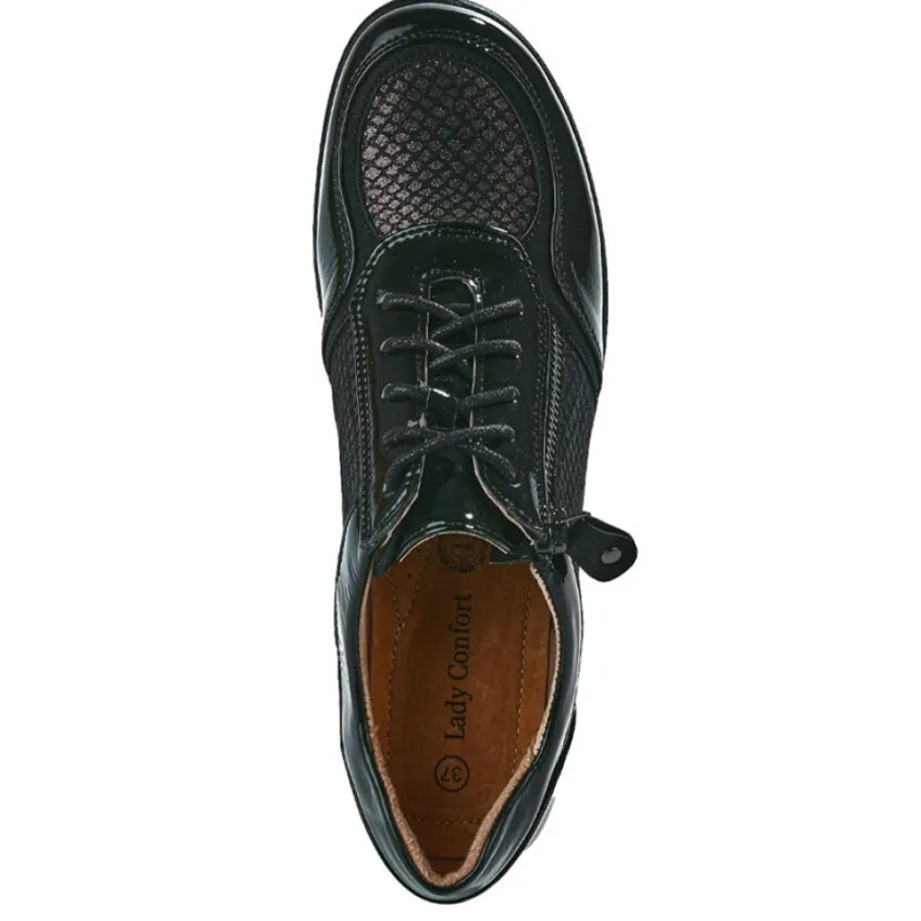 Baskets Confort Femme Bi-Matières Noir Lady Confort: Le Confort D’Une Basket Associé Au Charme D’Un Derby ! Parce Qu’Il Est Aussi Important De Se Sentir Bien Que Belle Dans Ses Baskets, Chaussexpo Vous Propose Ces Élégantes Chaussures Confort Pour Femme De La Marque Lady Confort. Dotée D’Une Doublure Et D’Une Semelle Intérieure En Cuir, Cette Paire De Baskets Noires Vous Procurera Un Confort Sans Pareil.Grâce À Sa Fermeture À Zip Sur Le Côté, Vous Chausser Deviendra Un Jeu D’Enfant. Un Talon Compensé De 3 Cm Vous Offrira La Hauteur Nécessaire Pour Marcher En Tout Confort. Enfin, Ces Baskets Bi-Matières Séduisent Par Leurs Jeux De Matières Chic Et Élégant : Le Fruit Du Mariage De Matières Vernies Et Irisées.Caractéristiques : Dessus En Synthétique, Doublure Cuir, Semelle Élastomère.