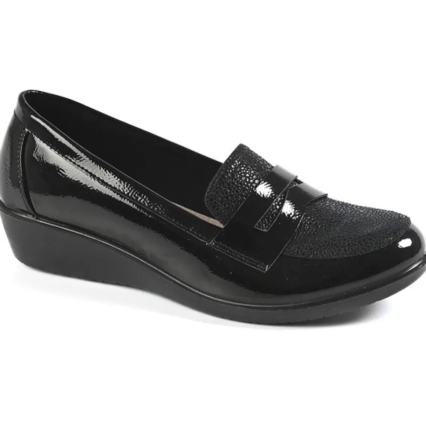Mocassins Compensés Femme Noir Vernis Lady Confort: Pour Bénéficier D’Un Confort Absolu Tout En Restant Chic Au Quotidien, Vous Pourrez Compter Sur Ces Mocassins Noirs Bi-Matières. On Adore Le Contraste Entre La Matière Vernie Et La Claque Irisée. Le Secret De Leur Confort Absolu ? Un Talon Compensé De 3,5 Cm, Une Forme Large Et Une Semelle Intérieure En Cuir Moussée. Cette Semelle Anatomique Vous Garantit En Prime Un Bon Soutien De La Voûte Plantaire. Un Mocassin Confortable À Porter Au Quotidien Comme Avec Une Tenue Plus Habillée.Caractéristiques : Grand Confort, Forme Large, Dessus En Synthétique, Doublure Textile, Semelle Intérieure Cuir, Semelle Élastomère, Talon 3.5 Cm.