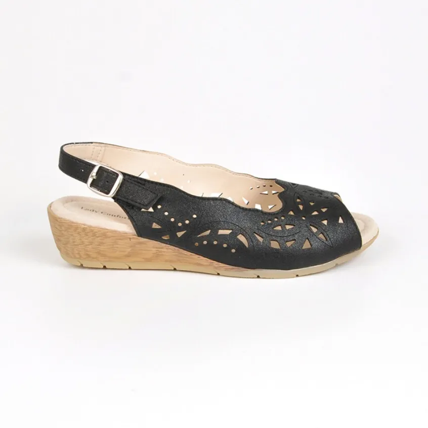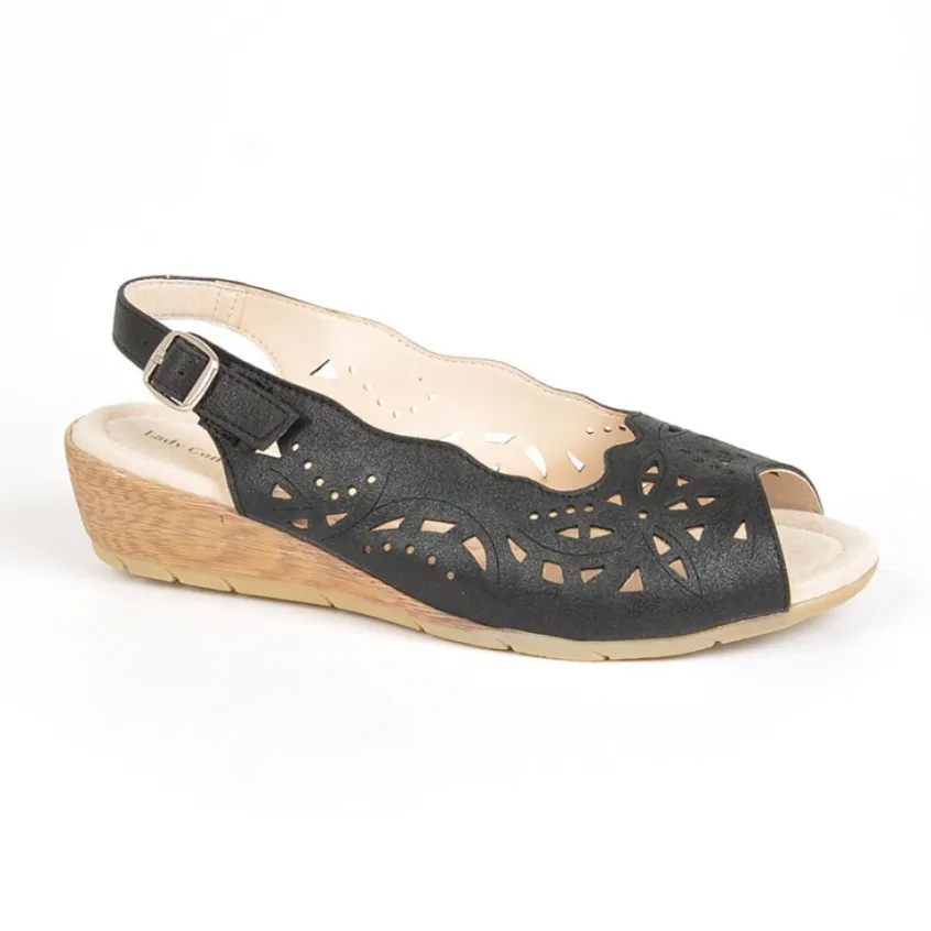 Sandales Compensées Lady Confort Noir En Cuir: Grand Confort, Forme Largesandales Compensées Femme Semelles Souples Confort, Marque Lady Confort, Coloris Noir, Dessus En Synthétique, Doublure Textile, Semelle Intérieure Cuir, Semelle Élastomère, Talon 3 Cm.