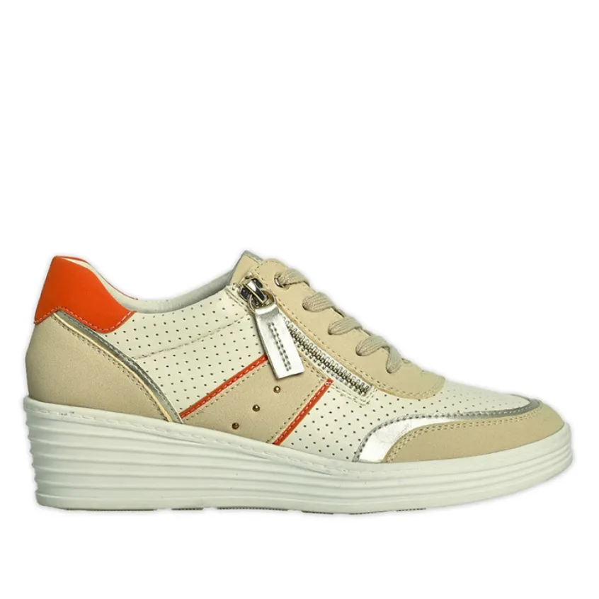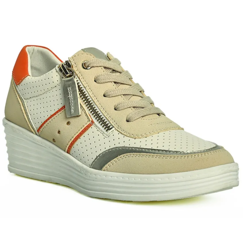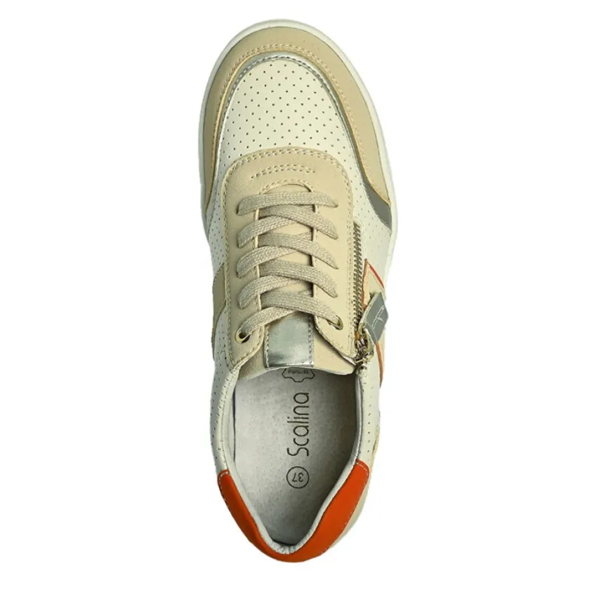 Baskets Compensées Femme Beige Scalina: Prenez De La Hauteur En Tout Confort Aves Nos Baskets Compensées De La Marque Scalina. Conçues Spécialement Pour Les Pieds Sensibles, Ces Chaussures Au Talon De 5 Cm Sont Munies D’Une Semelle Intérieure En Cuir Moelleuse Et Respirante. En Prime, Ces Baskets Confort À La Forme Large Disposent D’Une Fermeture À Zip Sur Le Côté Qui Permet D’Ouvrir La Chaussure Et De L’Enfiler En Toute Facilité.Des Lacets Plats Viennent Vous Assurer Un Maintien Parfait. Le Design De Cette Chaussure Est Réhaussé Par De Petits Clous Dorés Et Une Multitude D’Empiècements De Coloris Et De Matières Différentes. La Tige Blanc Cassé Couverte De Perforations Se Voit Ainsi Parsemée D’Un Élégant Patchwork De Beige, D’Orange Ou De Doré.Caractéristiques: Dessus En Synthétique, Doublure Synthétique, Semelle Élastomère.