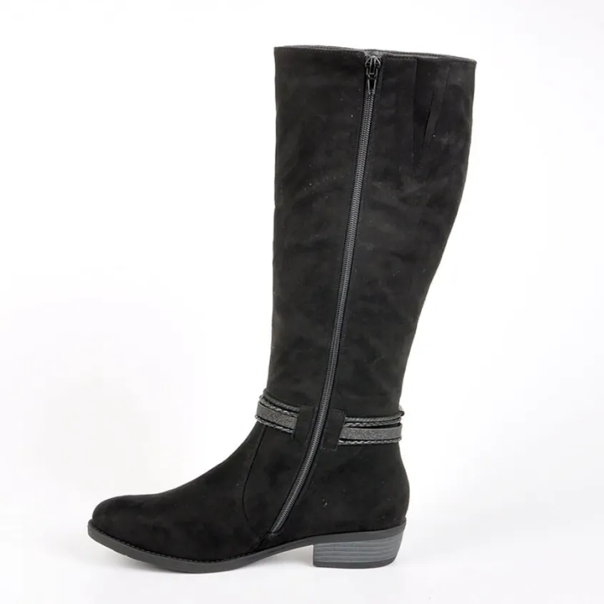 Bottes Plates Scalina Noir: Grand Confort, Forme Large Bottes Plates Femme Confort, Marque Scalina, Coloris Noir, Dessus En Synthétique, Doublure Textile, Semelle Intérieure Synthétique, Fermeture Avec Zip, Semelle Élastomère, Talon 3 Cm, Hauteur De Tige 37.5 Cm, Tour De Mollet 37 Cm.