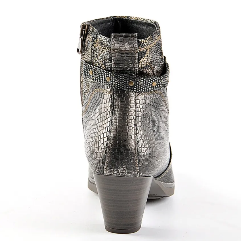 Bottines À Talons Avec Effet Reptile Scalina Bronze: Grand Confort, Forme Large Bottines À Talons Avec Effet Reptile Femme Confort, Marque Scalina, Coloris Bronze, Dessus En Cuir, Doublure Textile, Semelle Intérieure Cuir, Fermeture Avec Zip, Semelle Élastomère, Talon 5.5 Cm.