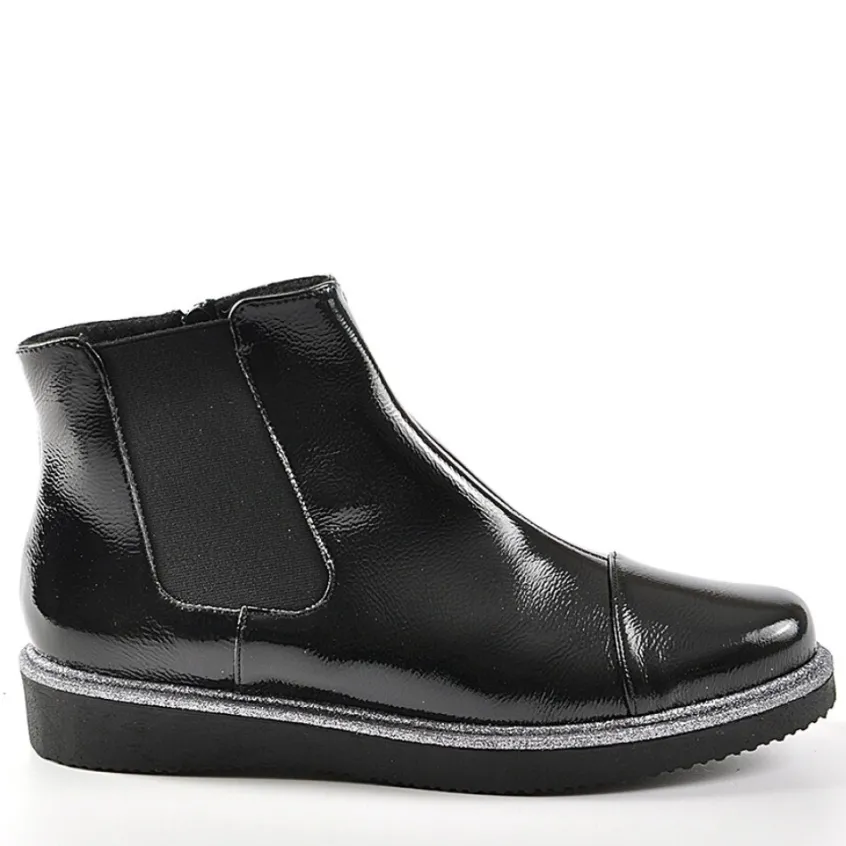 Bottines Plates Avec Élastiques Scalina Vernis Noir: Grand Confort, Forme Largebottines Femme Plates Avec Élastiques Confort, Marque Scalina, Coloris Vernis Noir, Dessus En Synthétique, Doublure Textile, Semelle Intérieure Textile, Fermeture Avec Zip, Semelle Élastomère, Talon 3 Cm.