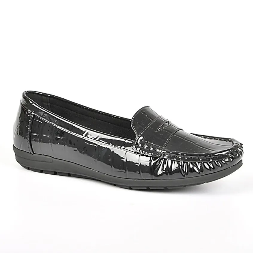 Mocassins Femme Avec Effet Croco Scalina Noir: Grand Confort, Forme Largemocassins Femme Avec Effet Croco Confort, Marque Scalina, Coloris Noir, Dessus En Synthétique, Doublure Textile, Semelle Intérieure Cuir, Semelle Élastomère, Talon 2 Cm.