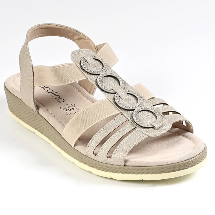 Sandales Compensées Femme Scalina Beige: Grand Confort, Forme Largesandales Compensées Femme Avec Élastiques Confort, Marque Scalina, Coloris Beige, Dessus En Synthétique Et Textile, Doublure Synthétique, Semelle Intérieure Cuir, Semelle Élastomère, Talon 3 Cm.